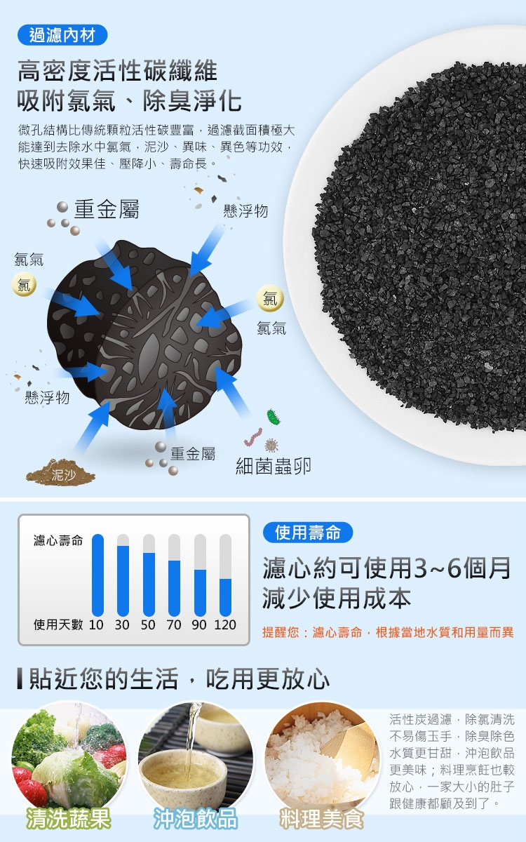◆過濾餘氯快速又有效,每天用水更健康、更安全。