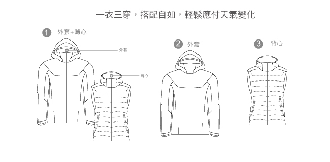 1)兩件合穿:極致禦寒,適合冬季及賞雪、登山