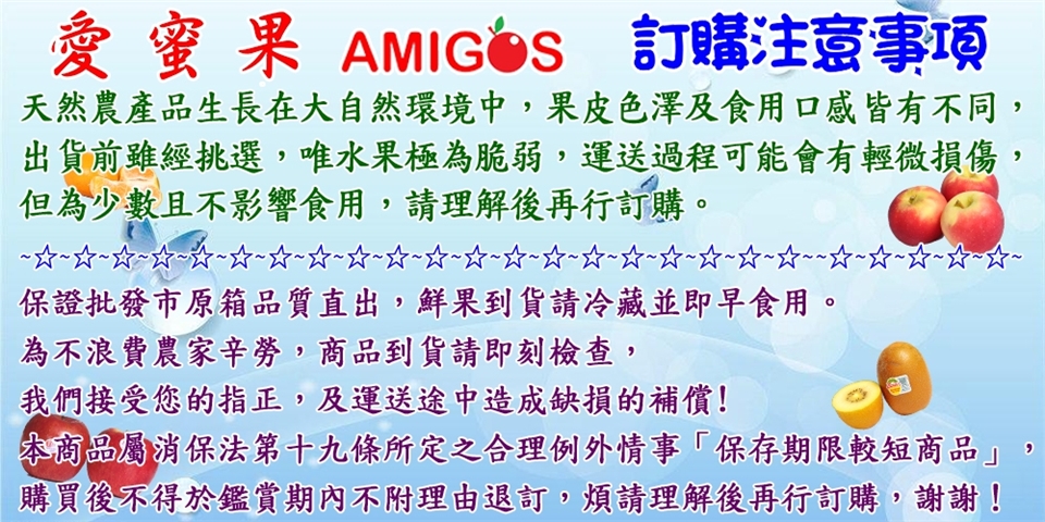 保證批發市原箱品質直出,鮮果到貨請冷藏並即早食用。 為不浪費農家辛勞,商品到貨請即刻檢查, 我們接受您的指正,及運送途中造成缺損的補償! 本商品屬消保法第十九條所定之合理例外情事「保存期限較短商品」,不適用鑑賞期,煩請理解後再行訂購,謝謝!