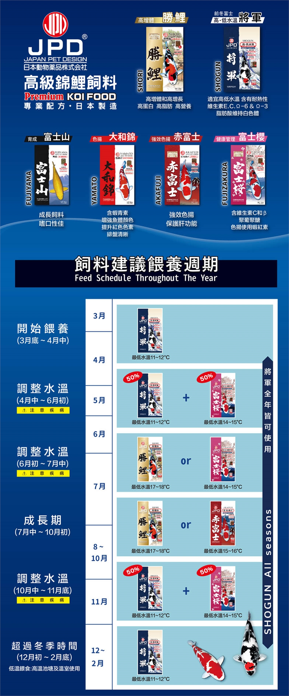 ★充分考慮低水溫的消化吸收性能的基礎上,科學配加小麥胚芽和有益生菌而精心研製的錦鯉用全季節飼料。
