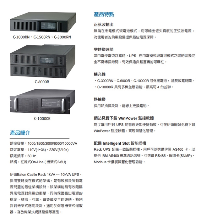 Rack UPS 配備一個智慧插槽,用戶可以選購伊頓 AS400 卡,以提供 IBM AS400 標準通訊信號。可選購 RS485、網路卡(SNMP)、Modbus 卡擴展智慧化管理功能。