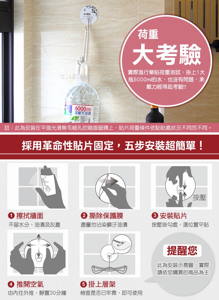 4.請勿安裝於不平整、不規則、粗糙及脆弱易脫皮之表面,以免商品掉落。