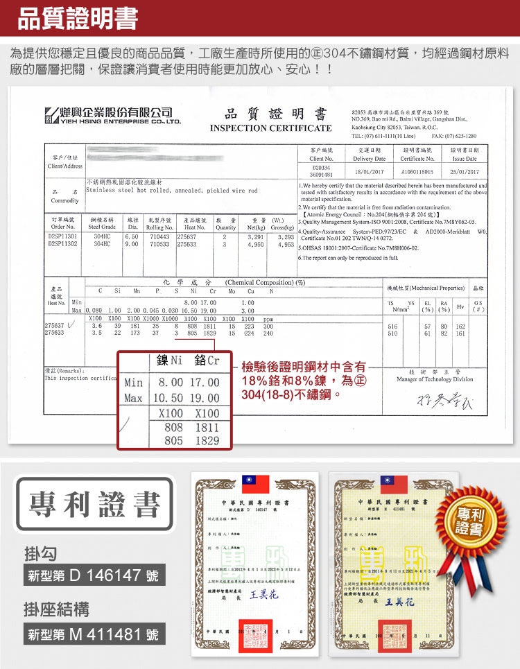 採SUS304 (18-8)高品質不鏽鋼製造,無生鏽疑慮,為同質性產品能找到的最高使用材料等級 ,製造商為已有二十多年經驗的外銷廠商,品質保證。