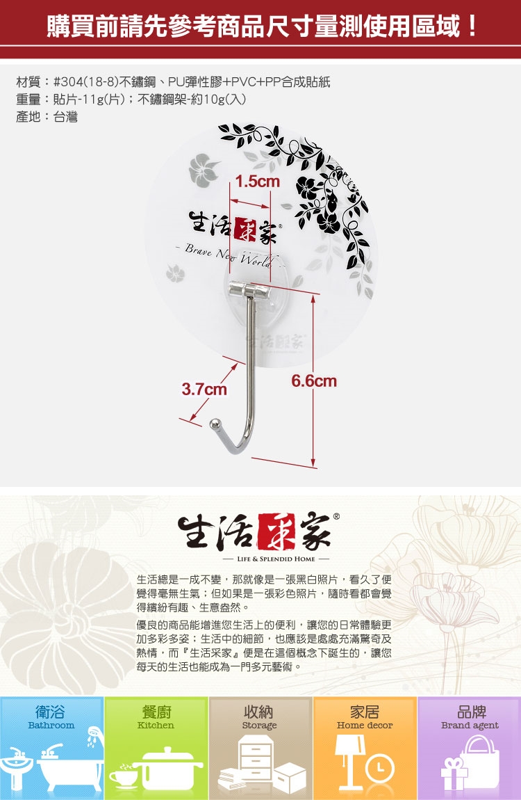 台灣自製優良商品又來了 !!革命性新世代商品,【生活采家樂貼系列304不鏽鋼收納架】完全顛覆傳統掛釘安裝,不須打釘、不用膠條,免除繁雜的安裝手續,隨手一貼即可強力附著在平整光滑的牆面,貼片搭配各式功能304不鏽鋼架,可用於家中廚房、衛浴等場所,實用性廣, 不鏽鋼製品二十幾年外銷經驗,商品深受歐美日等地區肯定,堅持不用次級材料,只選用正統高級#304(18-8)不鏽鋼,品質好不會生鏽,絕對是您生活中的不二選擇!!