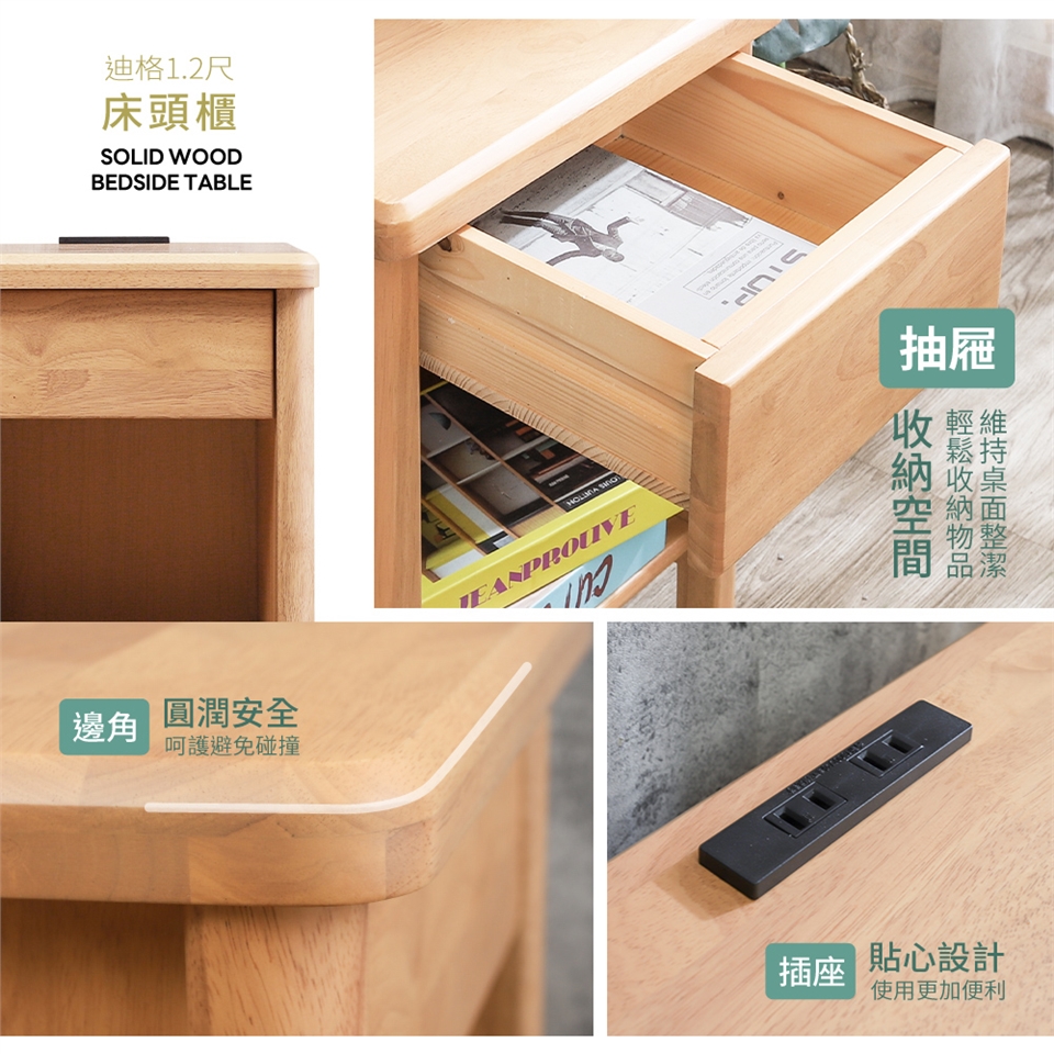 收納抽屜選用實木凹槽軌道設計,極佳的滑順度,使用輕鬆容易。