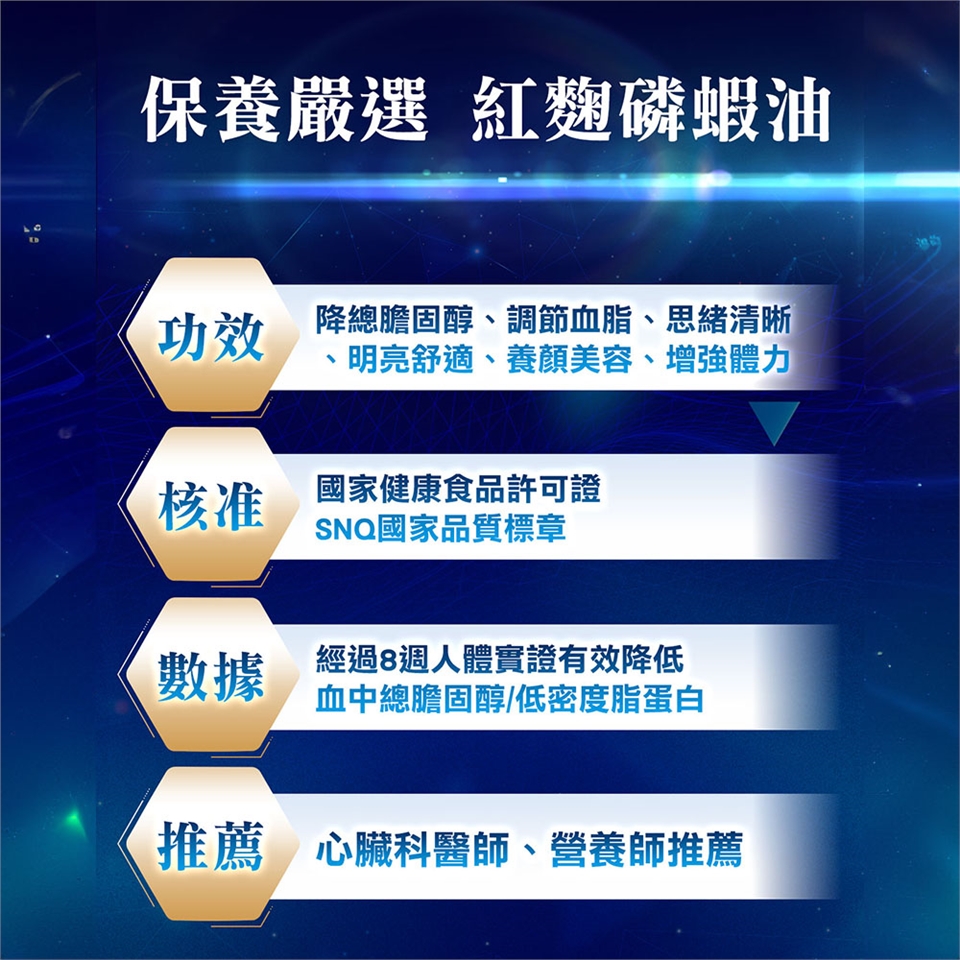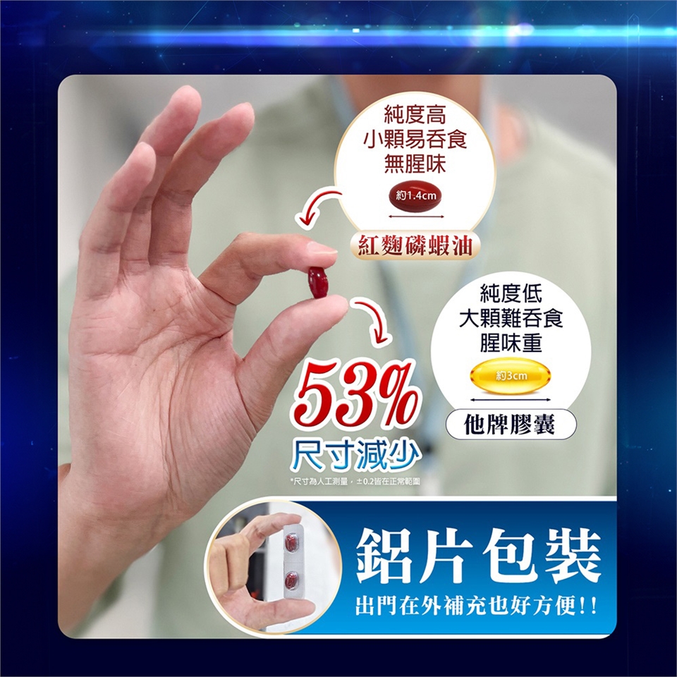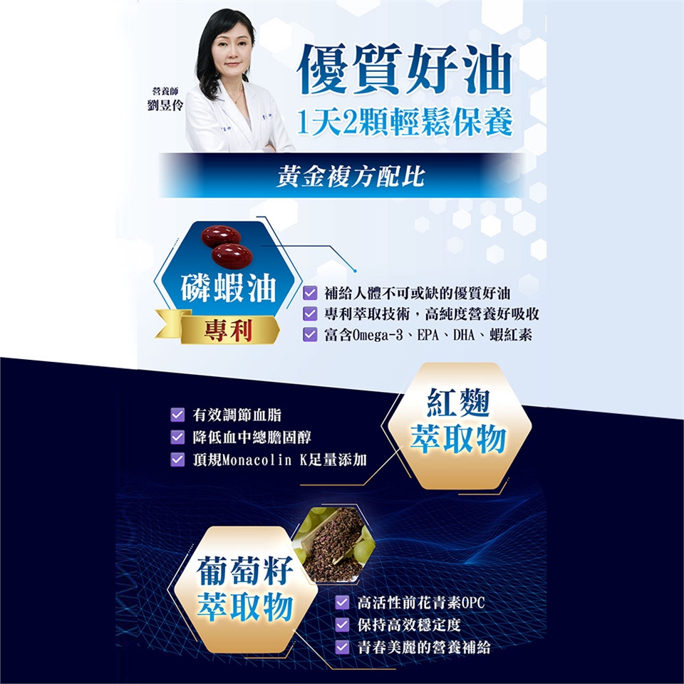 ◆內容物成分:磷蝦油、紅麴萃取物、脂肪酸甘油脂、葡萄籽萃取物、維生素E(抗氧化劑)