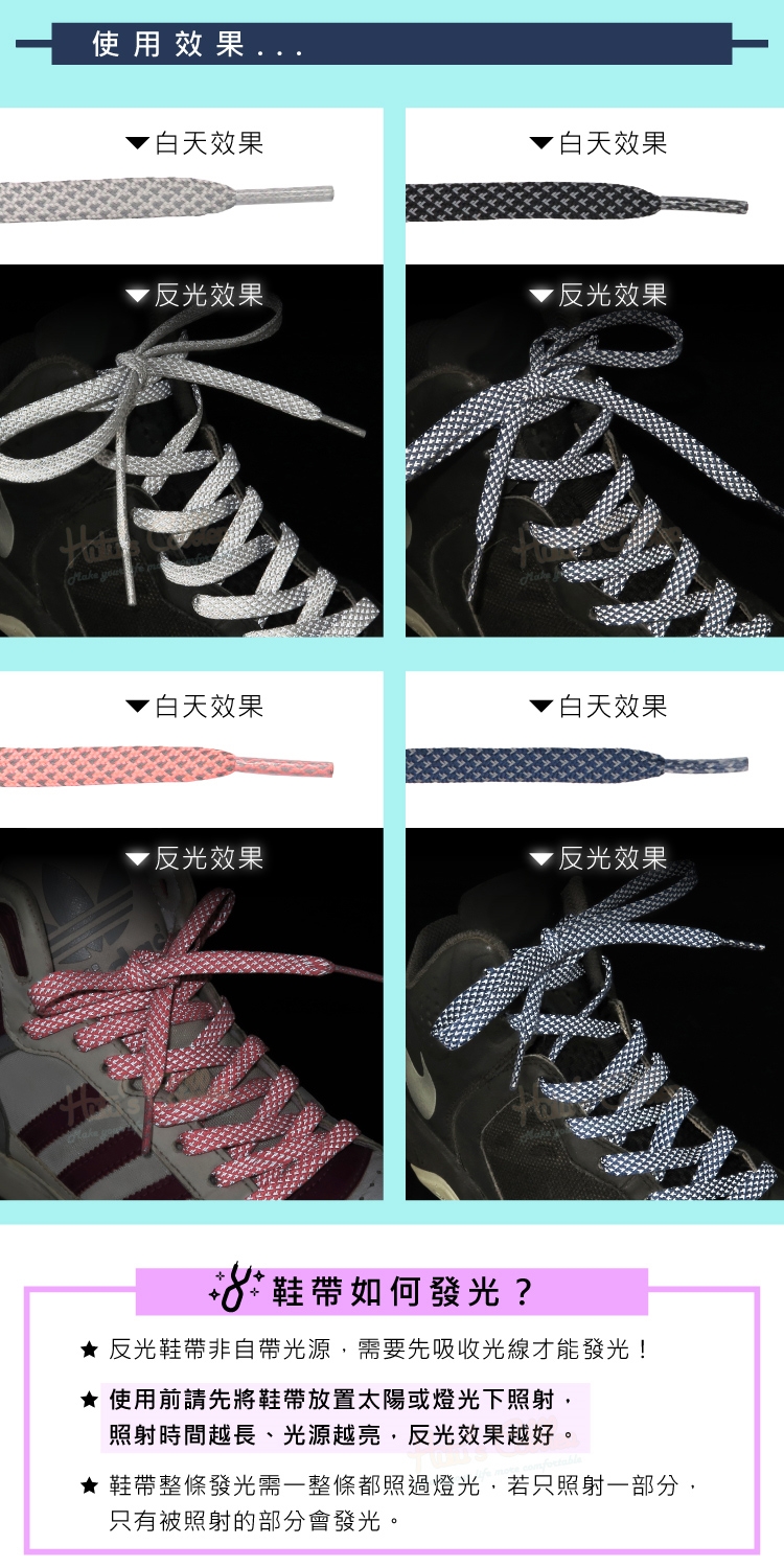反光鞋帶非自帶光源,需要先吸收光線才能發光!