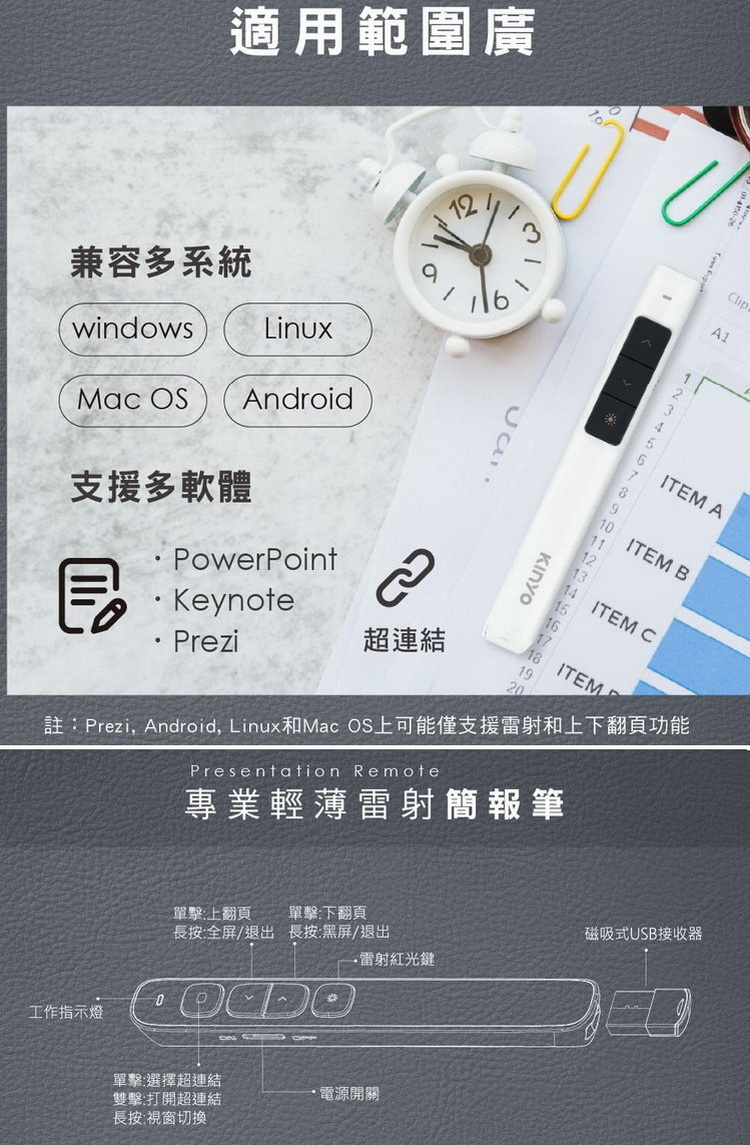 注意 : Prezi,Mac OS,Linux,Android上,可能僅支援雷射和上下翻頁功能