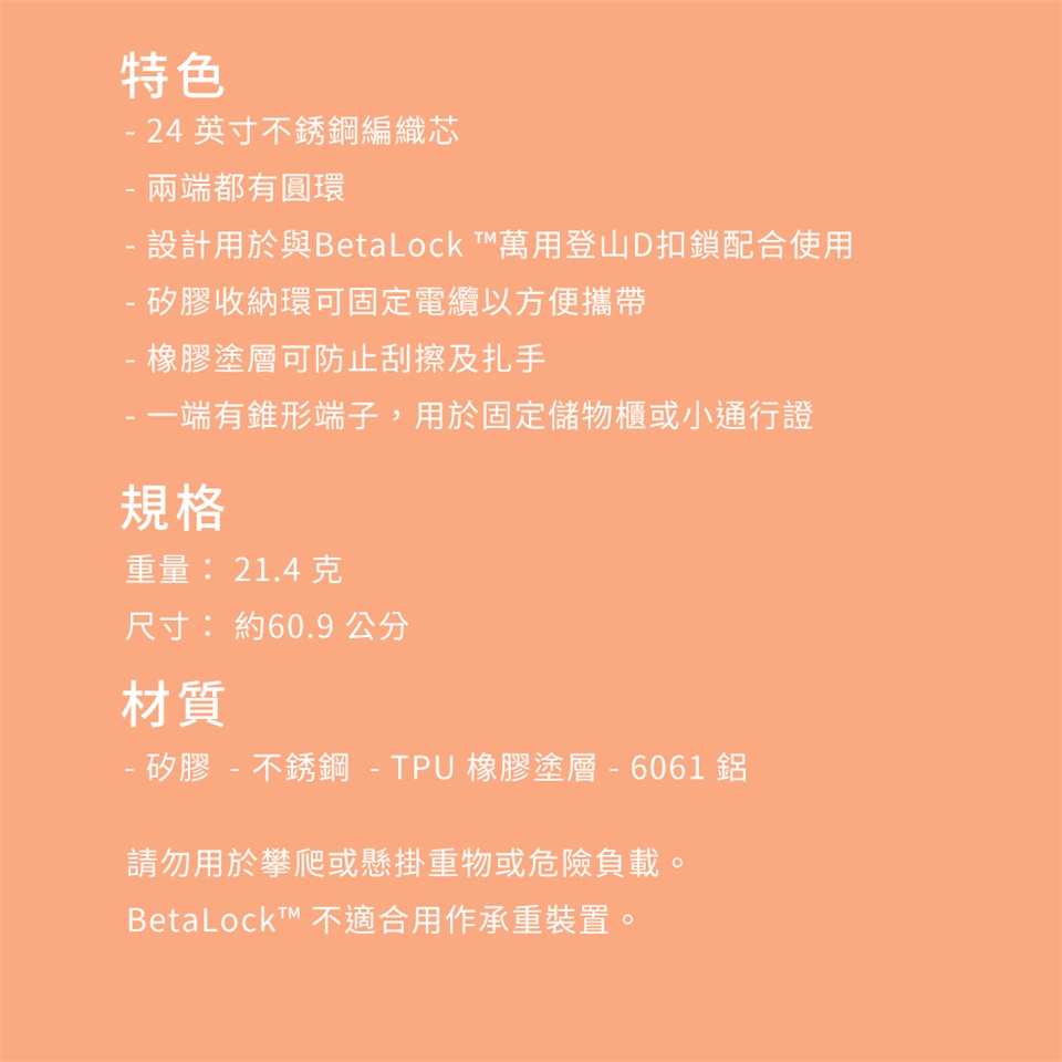 - 設計用於與BetaLock TM萬用登山D扣鎖配合使用