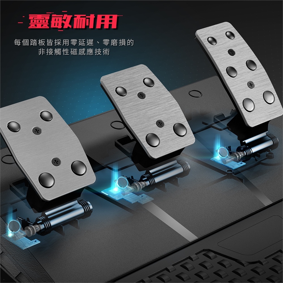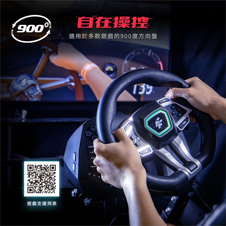 內附六速排檔桿及搭載磁感應技術的金屬踏板,輕鬆入手遊戲方向盤套組。可調式RGB呼吸燈光效,以及900度轉向角度,大幅提高遊戲的沉浸感。