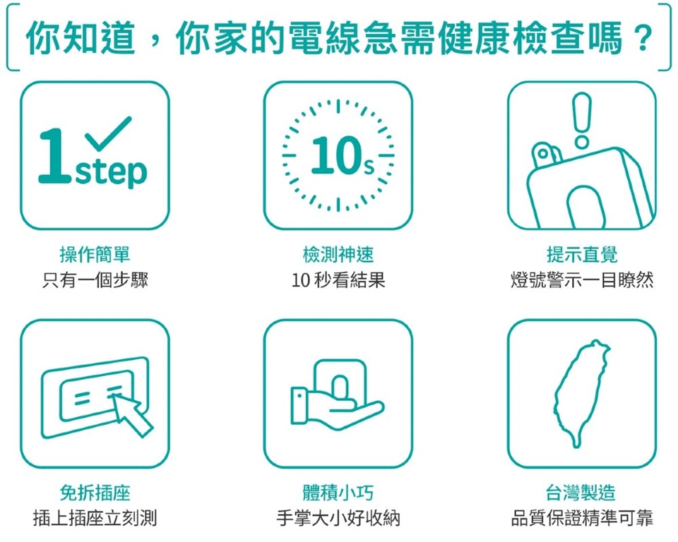 只需要插上插座,10 秒檢測插座&電線老化程度,有效預防電線走火,就像幫房子檢查哪裡有血管堵塞!全家人的幸福,即刻升級!