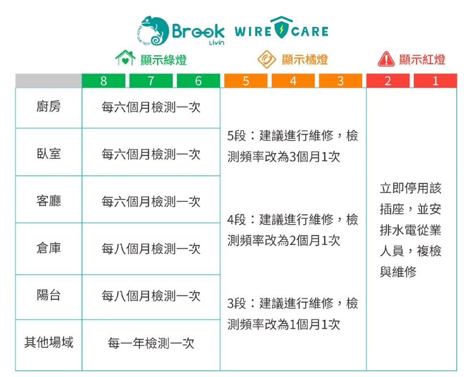 紅燈:代表可能隨時有走火危險!儘速請水電師傅前來詳細檢查,並建議更換插座或電線。