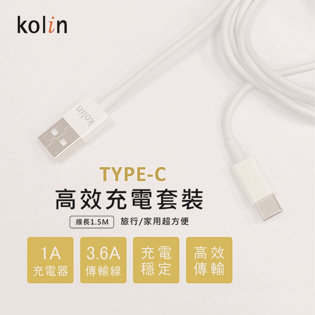 Kolin歌林 TYPE-C高效傳輸充電線+USB充電器 KEX-DLCP116