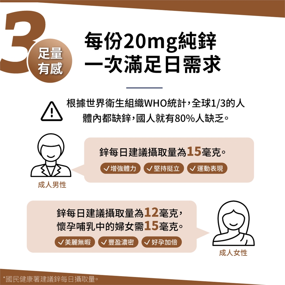 3. 每份足量有感:每份20mg純鋅滿足日需求、有助男性增強體力、堅持挺立及提升運動表現,並助女性肌膚健康、豐盈濃密和備孕順利。