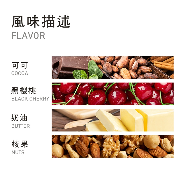 散發可可香氣,入口後的活潑酸質如同熟透的櫻桃一般,最後殘留在唇齒間帶有溫和的水果甜香,整體口感乾淨層次分明。