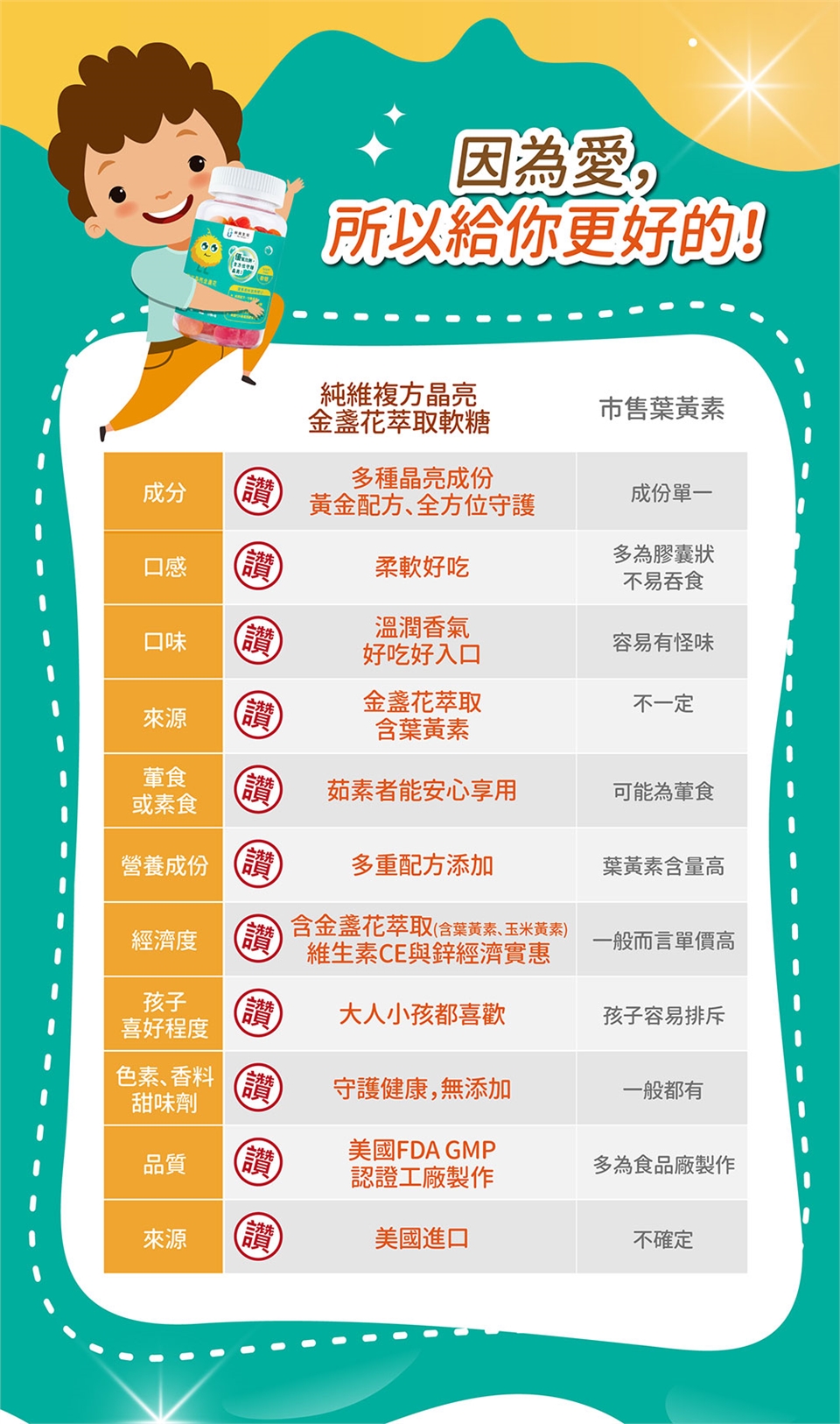 2.添加了金盞花萃取(含葉黃素與玉米黃素)、維生素C&E、鋅!