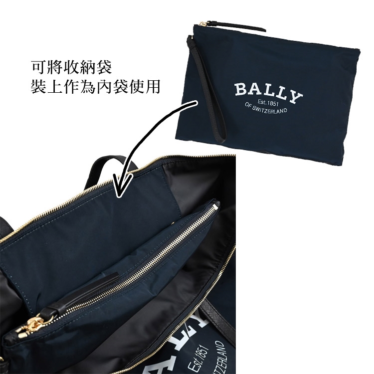 瑞士工藝代表百年精品BALLY,採用質感尼龍拼接皮革搭配經典燙印大LOGO,拉鍊開口,可裝A4文件、衣物、摺疊傘等隨身物品,附1收納手拿包(可扣於托特包內作拉鍊內袋使用),包包可摺疊收納至手拿包中,包身後方設有行李箱插帶可固定於行李箱上,設計簡潔有型且超大收納容量,無論上班或外出出遊逛街都合適,是款輕便又實用的包款。