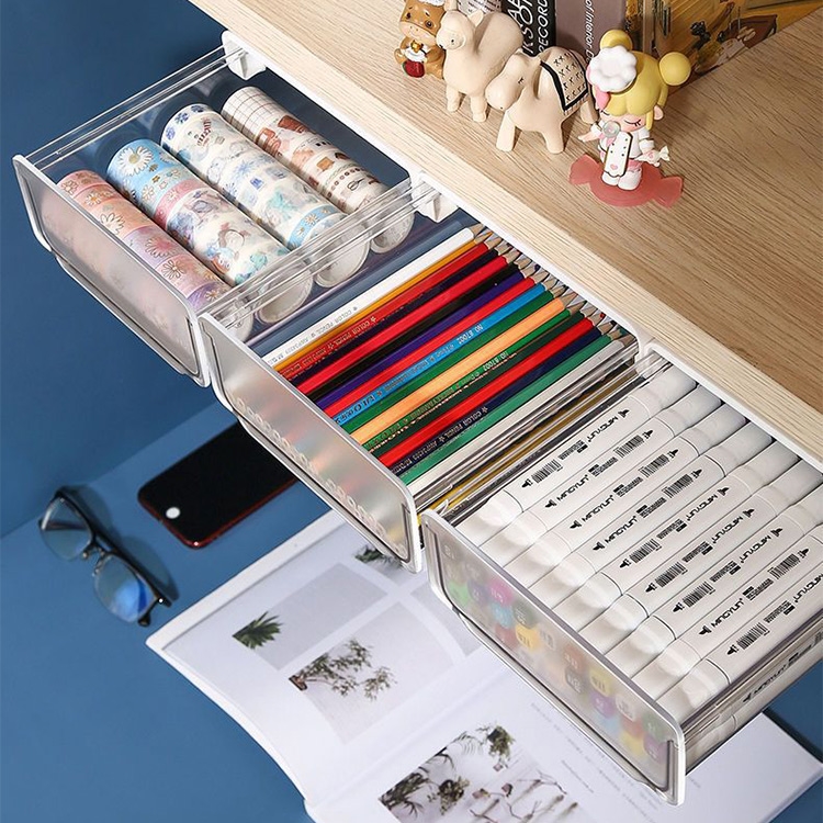 家中的桌子櫥櫃缺少收納空間嗎?您需要極好用的加高磨砂桌下抽屜收納盒,加高7cm市面之最,可容納多本A6/B6的筆記本大小,如一般抽屜軌道卡扣設計,拉過頭也不掉落,附贈強力無痕貼片高承重1.5~2.5KG,也可使用螺絲鑽孔安裝,承重力更強!高質感霧面磨砂前面板,隱密美觀看不穿,有手把滑順推拉、圓潤邊角防刮傷、緊密貼合防蟲防塵,多功能應用適合各式桌子櫥櫃。