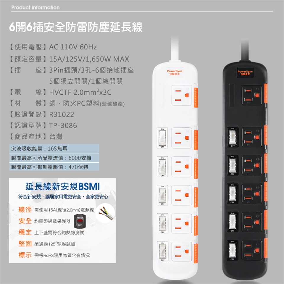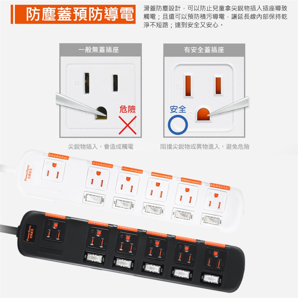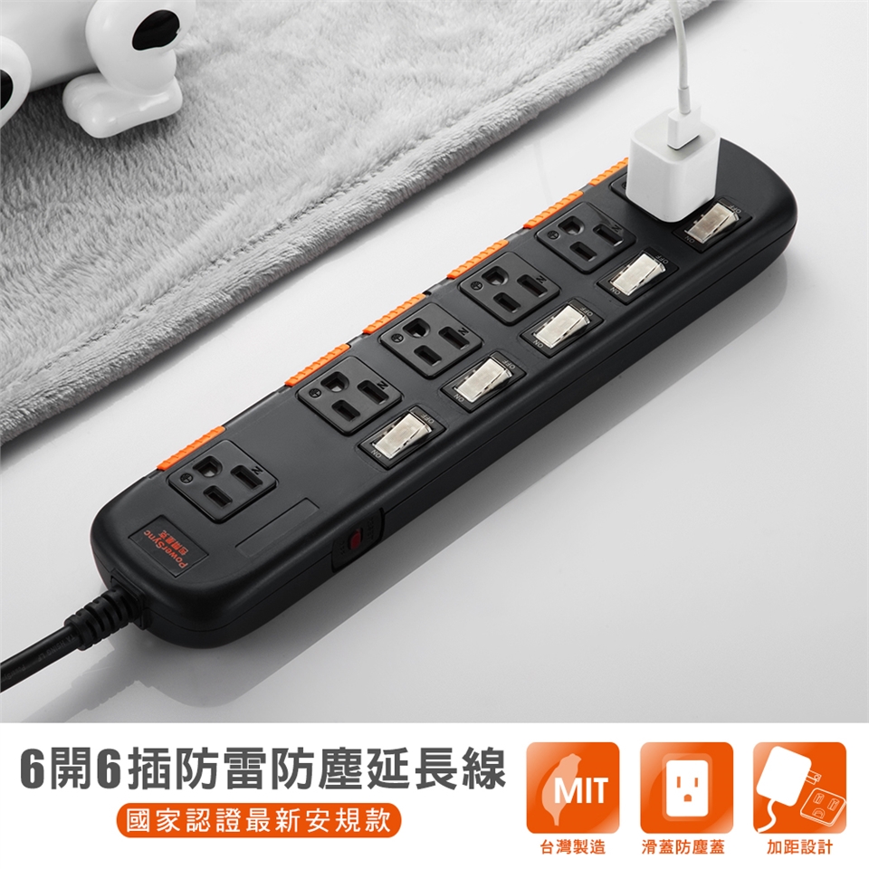 ● 品名:6開6插安全防塵防雷擊延長線​