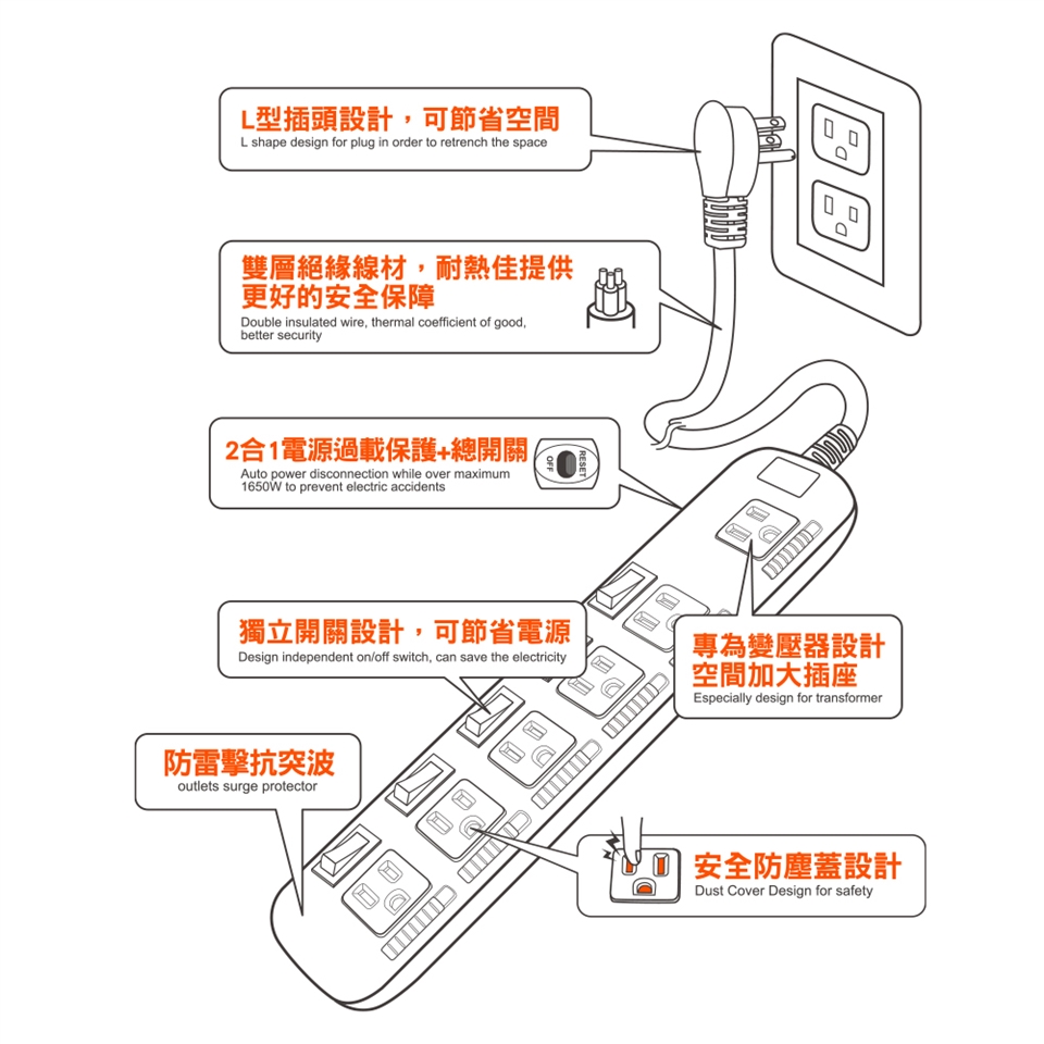 ※本產品為室內使用,請勿置於潮濕空間或於戶外使用並遠離火源或高溫環境下使用。※請勿自行拆解產品可能導致功能無法正常運作。※請注意開封避免包材刮手。※ 檢查本產品時,請移除所有插頭。※含有過載保護功能,過載使用時會斷電。※本產品已投保新台幣一千萬產品責任險。※請詳閱包裝上說明後購買,拆封恕不退換!※本產品限台灣地區使用(For Taiwan use only)