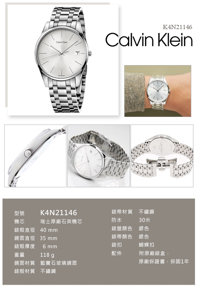 極簡風格是CK (Calvin Klein) 的招牌設計,也是現今的流行風潮,可是當極簡風格不再是一種流行趨勢時,純淨、性感、優雅風格統一。當CK (Calvin Klein) 的極簡風格在腕錶中延續,就是純淨的黑色與銀色、乾淨簡練的線條帶來的摩登感覺。 CK (Calvin Klein)造型簡約而不失成熟穩重,更強調實用性。