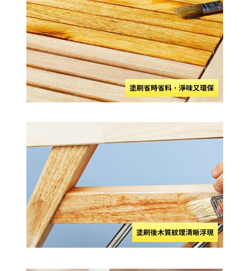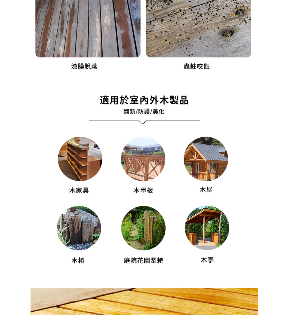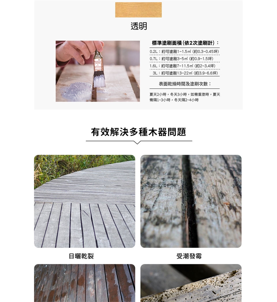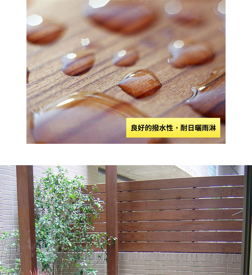 ●具有撥水效果,可長期保護雨水侵蝕,長期避免水分滲入木材