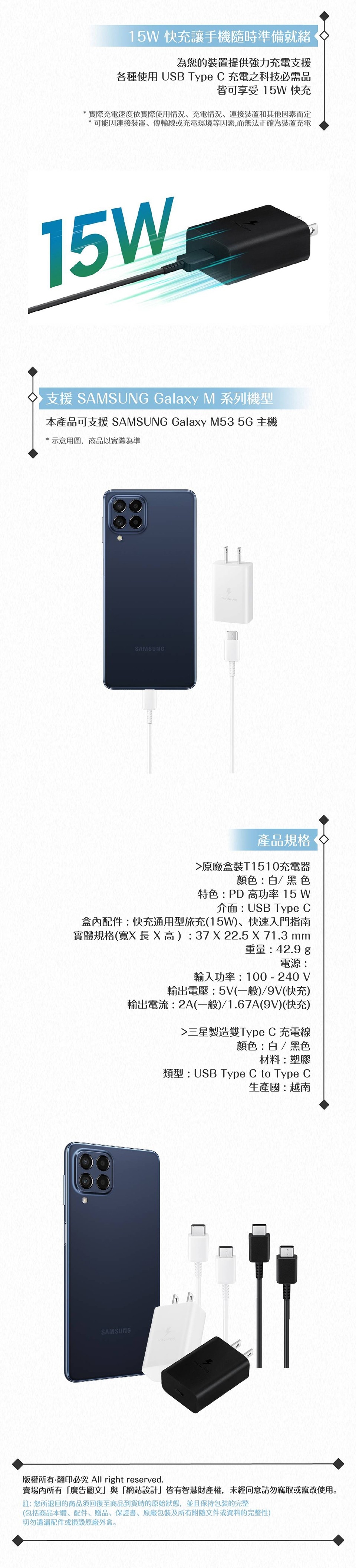 賣場商品:Samsung for M系列 15W快充旅充組Type C【附原廠盒裝T1510充電器+三星製造雙Type C線】