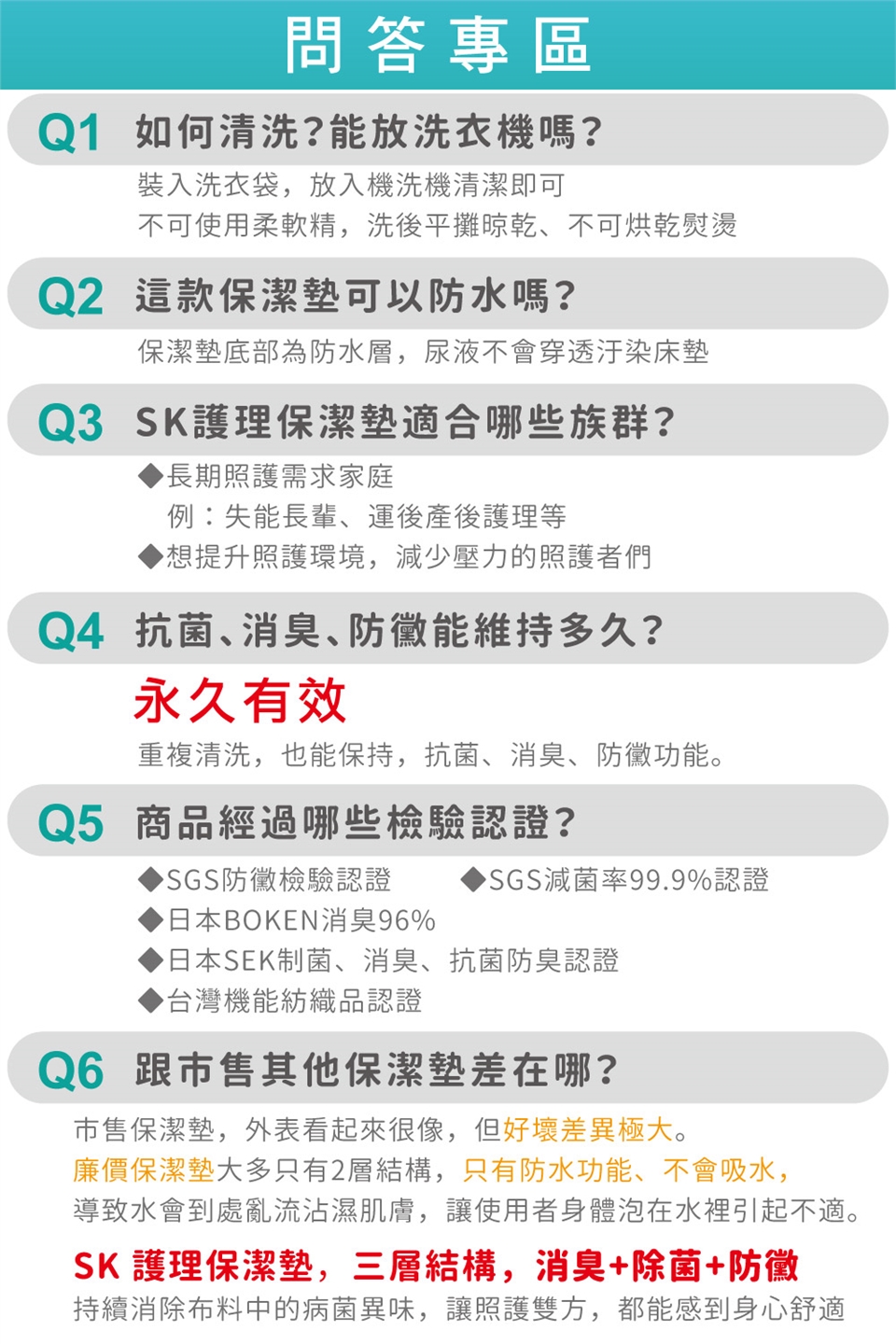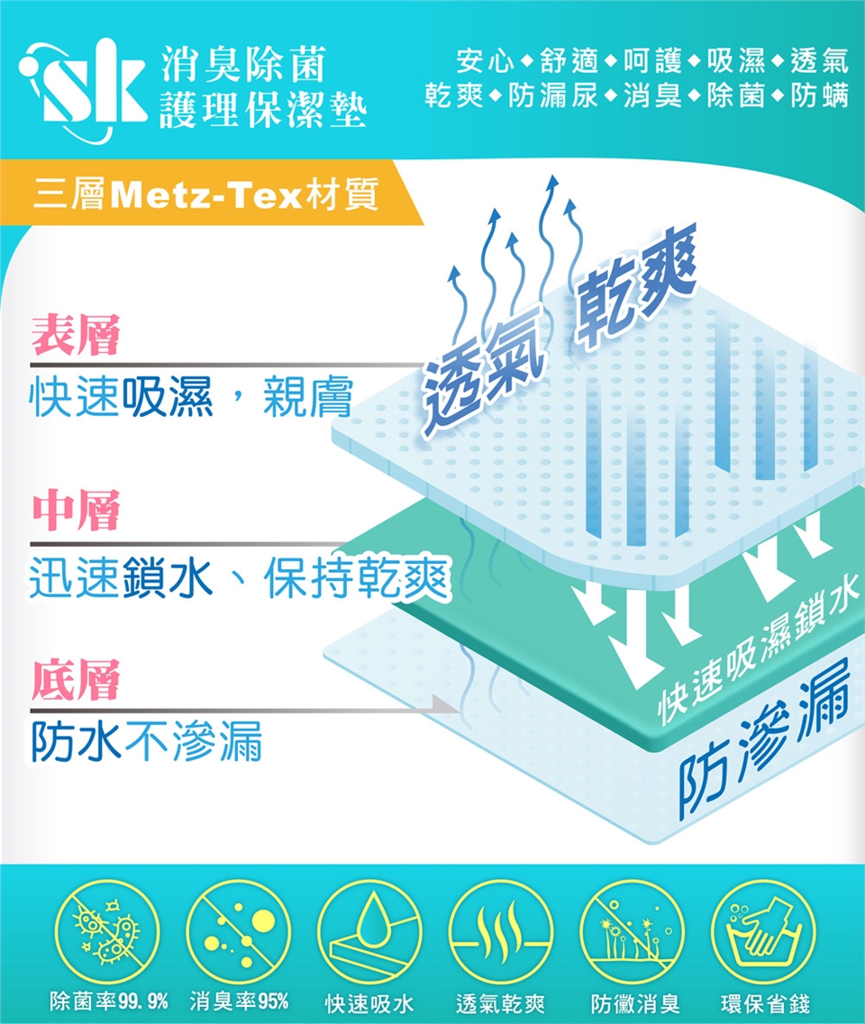 SK消臭除菌護理保潔墊用途: 使用於患者大小便失禁、老人夜尿、病房護理、嬰兒車墊、兒嬰床墊、婦女生理墊、長輩護理墊、隔尿墊。 產品特性:吸水性特強,乾爽表層,有最佳消臭防霉機能,防止臭味擴散汙染居住環境。鎖水性能強,透氣、吸濕、防潮、防漏尿、消臭、除菌、防蹣、柔軟、彈性、安心、舒適、呵護、美觀、防滲漏、輕鬆清洗、重複使用、環保。