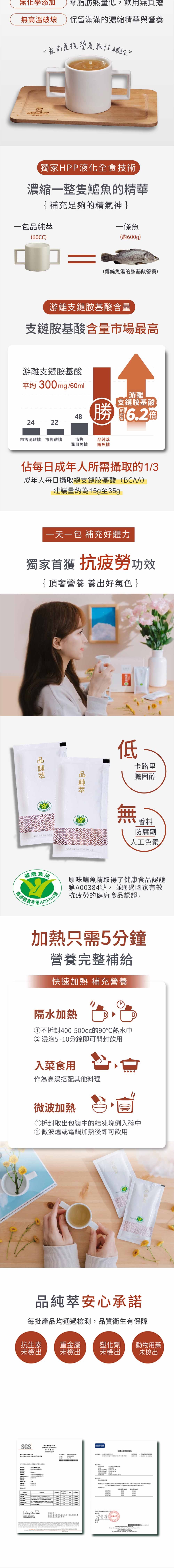 選用具產銷履歷認證、SGS認證無重金屬、無動物用藥殘留的黃金斑鱸魚,配合耗資上億台灣獨家專利的HPP高壓低溫萃取技術製造,完整保留鱸魚的營養精華。