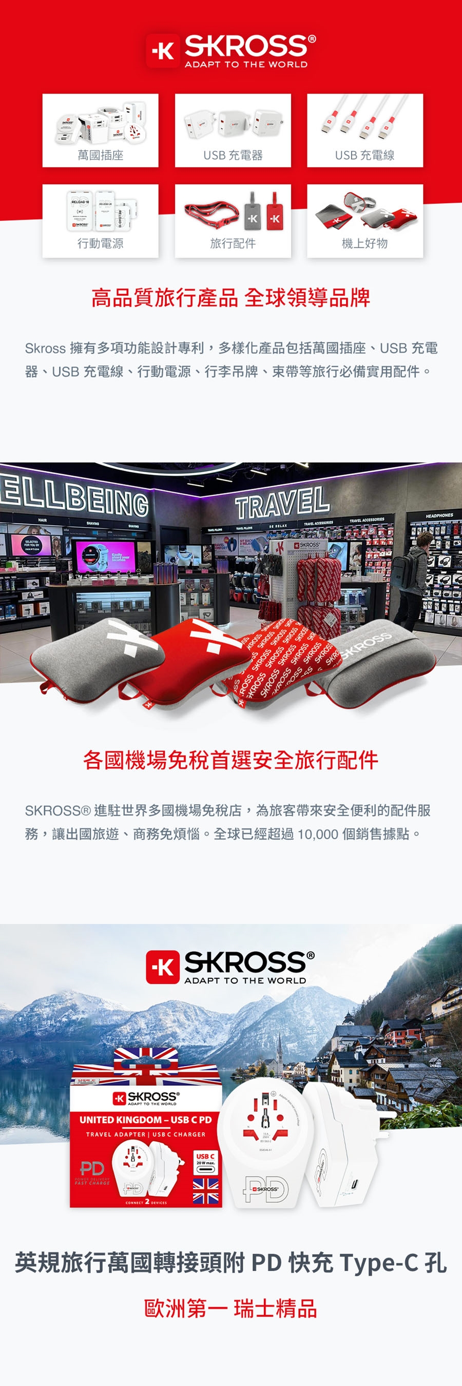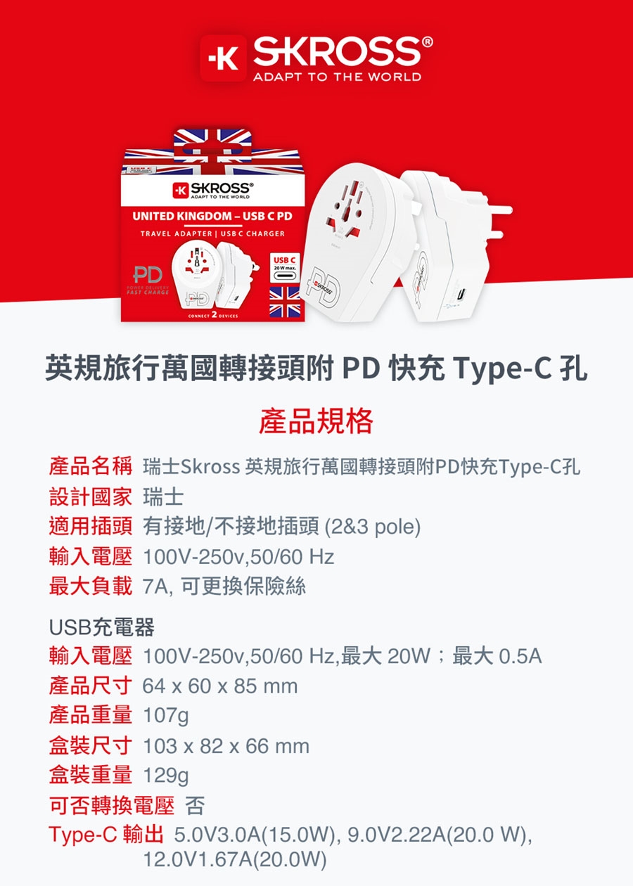 產品名稱:瑞士Skross 英規旅行萬國轉接頭附PD快充Type-C孔