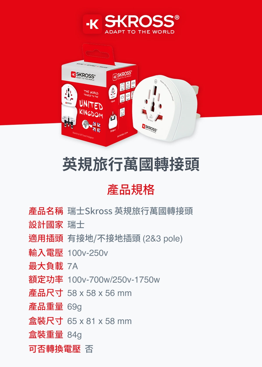 產品名稱:瑞士Skross 英規旅行萬國轉接頭