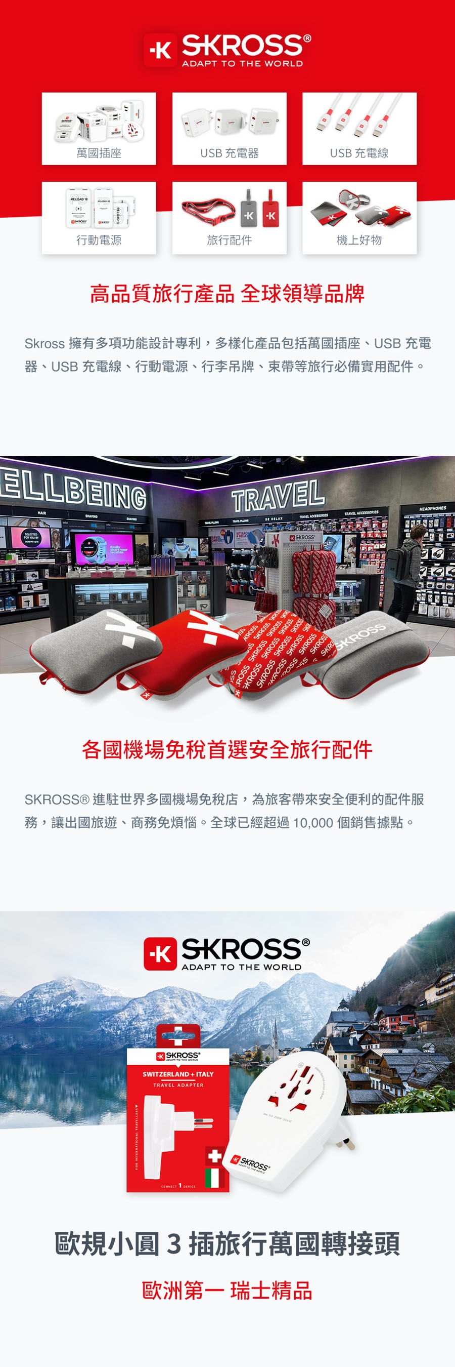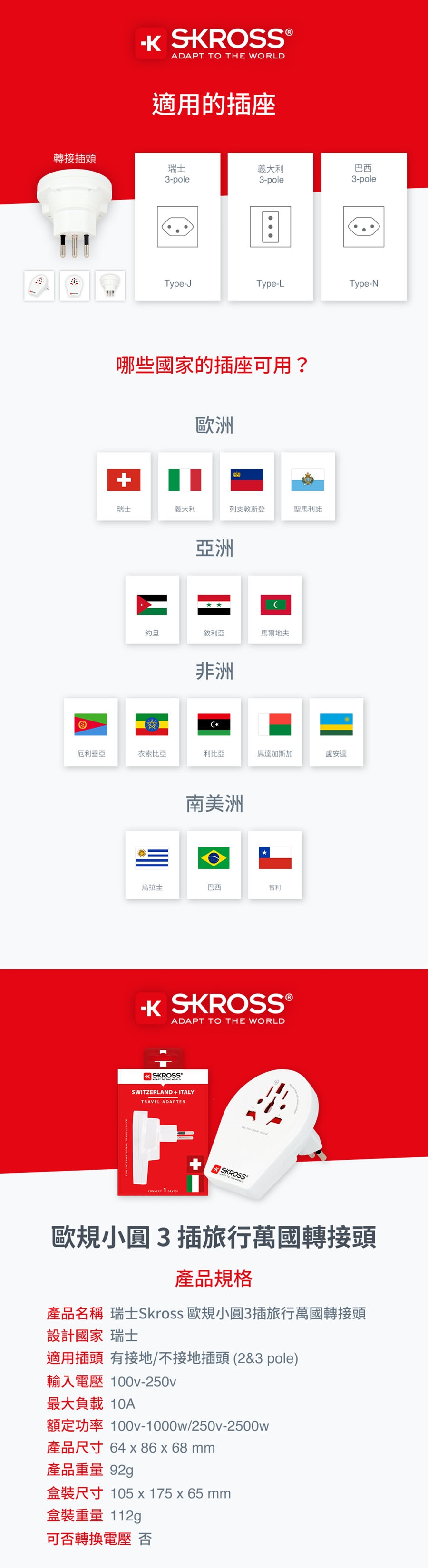 產品名稱:瑞士Skross 歐規小圓3插旅行萬國轉接頭