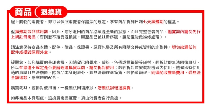 ※耗材類商品(碳粉匣、墨水匣、標籤帶)因性質特殊,購買後一經拆封恕不接受退換貨,購買時請多留意所選之型號。