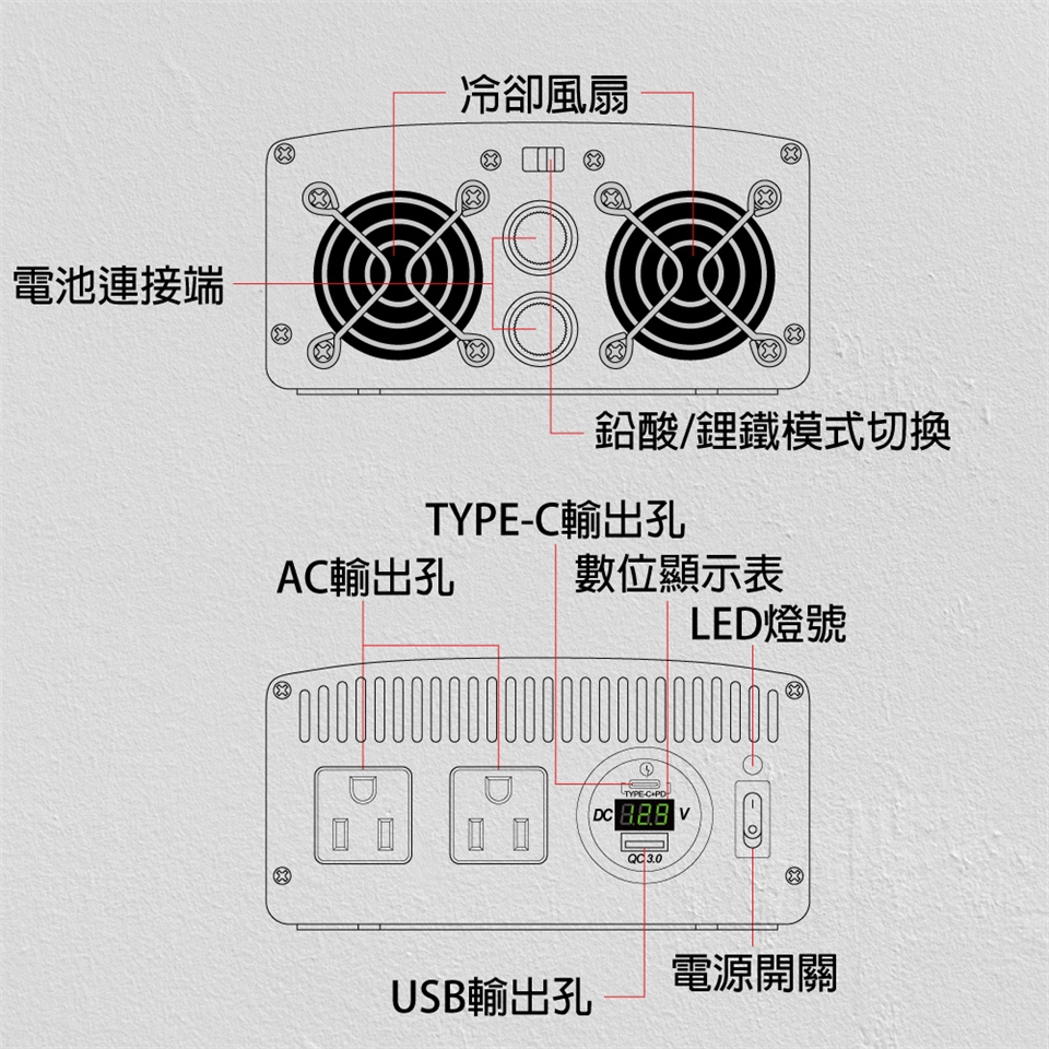 ● 本產品本身沒有內建電池,需搭配12V鉛酸/鋰鐵電池使用。