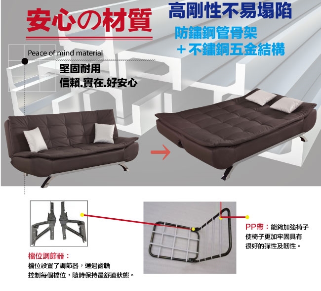 採用實木材質框架+防鏽鋼管結構&不鏽鋼五金結構+防鏽五金腳座+高回彈力泡棉+透氣柔韌皮革等安心材質
