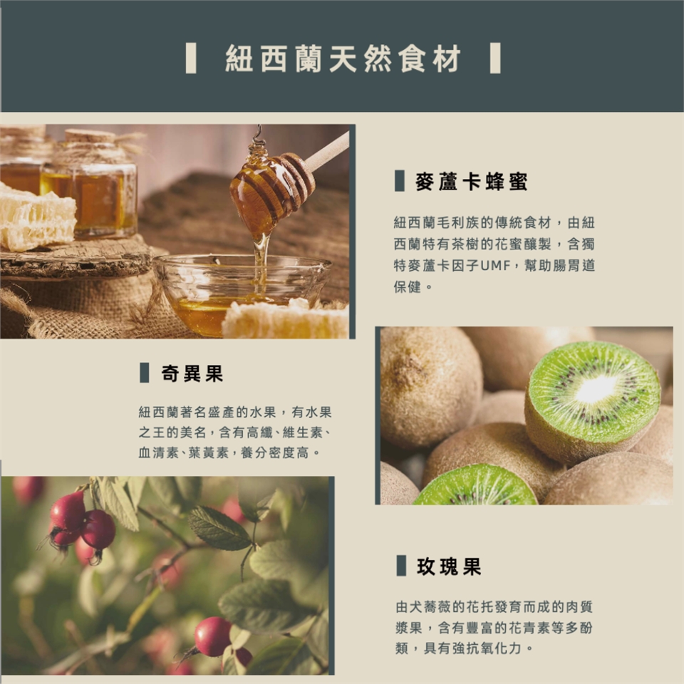 ‧全紐西蘭在地食材,含麥盧卡蜂蜜、奇異果、玫瑰果等紐西蘭特殊食材