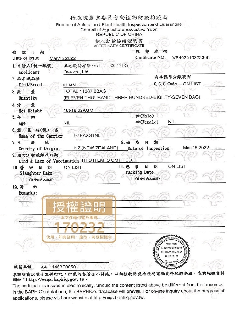 營養分析: 粗蛋白質23%以上、粗脂肪12%以上、粗纖維4%以下、水分10%以下、灰分9.8%以下(鈣2.15%以上、磷1.51%以上)