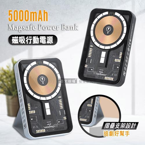 Wephone 5000mAh PD快充 MagSafe工業風透明磁吸支架行動電源 可上飛機
