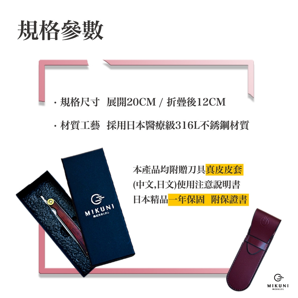 · 規格/尺寸:展開20cm, 折疊後12cm · 本產品均附贈刀具皮套,含(中文,日文)使用注意說明書、日本精品一年保固,附保證書
