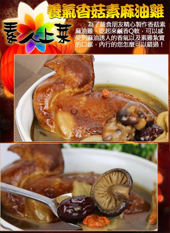 ◆為了蔬食朋友精心製作養氣香菇素麻油雞,吃起來鹹香暖呼呼