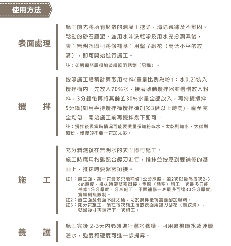 註1:直立面,第一次最多只能補修1公分厚度,第2次以後為每次2-3cm厚度,推抹時要緊密銜接。倒懸(懸空)施工一次最多只能補修1公分厚度,分次施工。平面補修一次最多可達30公分厚度,,寬幅則無限制。
