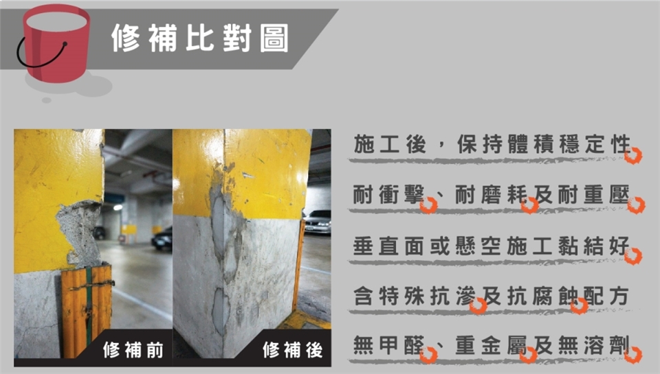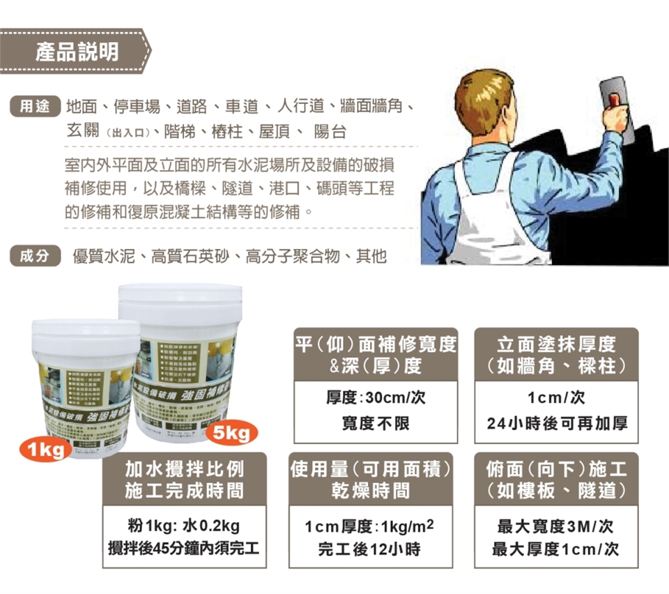 本品無論和新或舊混凝土的結合力都很好。加水攪拌即可使用,簡單方便。