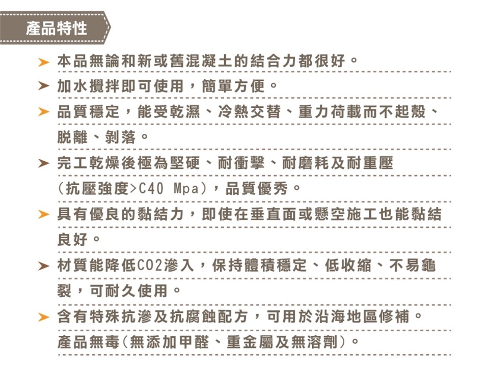 含有特殊抗滲及抗腐蝕配方,可用於沿海地區修補。