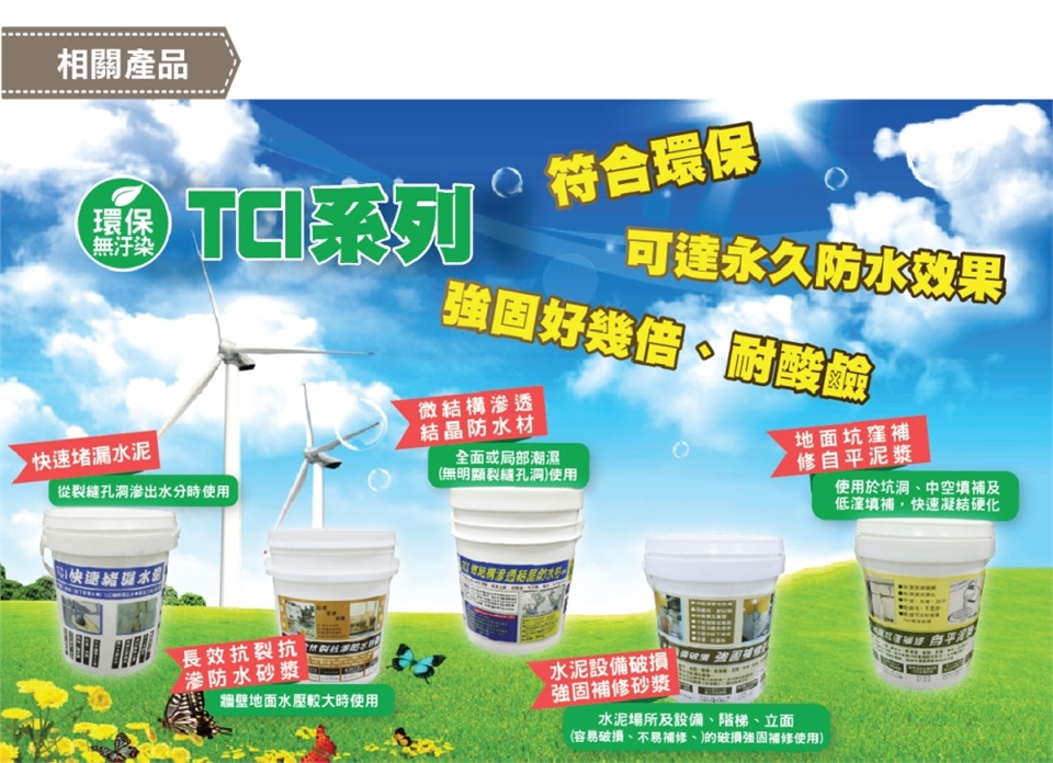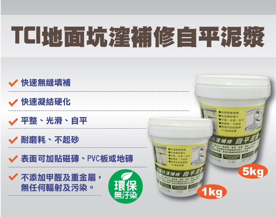 TCI地面坑窪補修自平泥漿是由特種水泥、石英砂及多種添加劑精確配方配製成的地面整平材料。