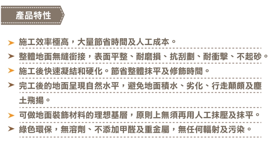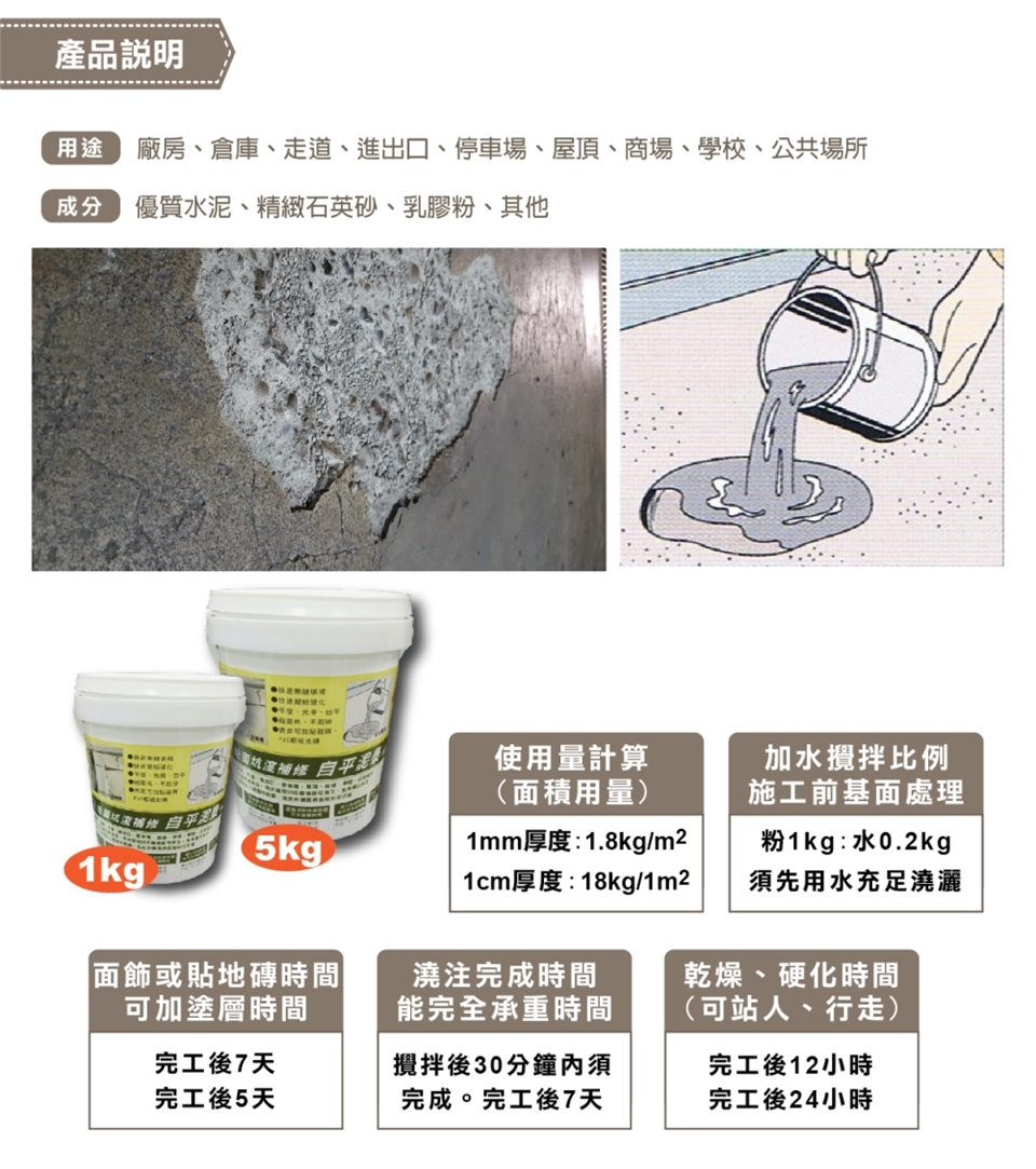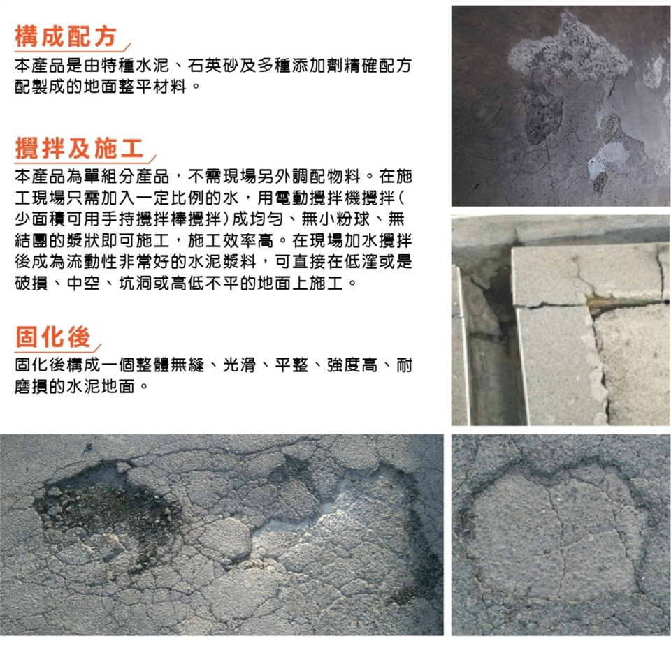 在現場加水攪拌後成為流動性非常好的水泥漿料,可直接在低漥或是破損、中空、坑洞或高低不平的地面上施工,固化後構成一個整體無縫、光滑、平整、強度高、耐磨損的水泥地面。