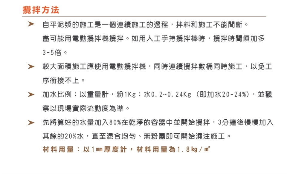 完成後,再開動攪拌機攪拌約2分鐘待表面生出氣泡後,即可施工。材料用量:以1㎜厚度計,材料用量為1.8kg/㎡