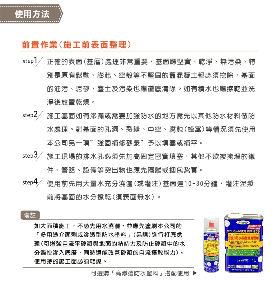 施工基面如有滲漏或需要加強防水的地方需先以本品牌的〝微結構滲透結晶防水材〞或〝水性高滲透防水塗料〞做防水處理。