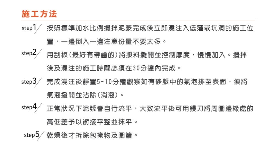 施工方法:按照標準加水比例攪拌泥漿完成後立即澆注入低漥或坑洞的施工位置。一邊倒入一邊注意份量不要太多。