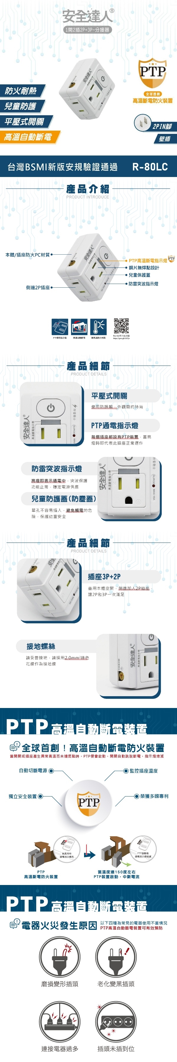 安全達人 1開2插3P+2P PTP保護 壁插 R-80LC