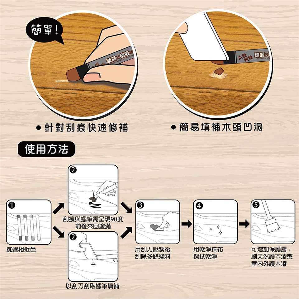 ●適用於填補木製品上寬度及深度均在2mm內的刮痕、裂縫、孔洞修補